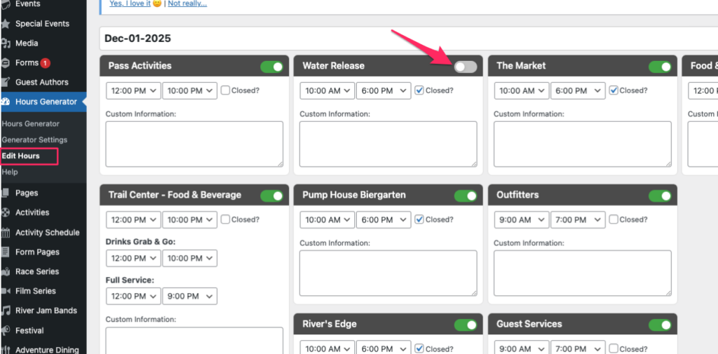 - To edit individual Food & Beverage hours once generated, go to “Pages” and “Food and Beverage” and select “Use Custom Time” and click “Add Row” and enter times.