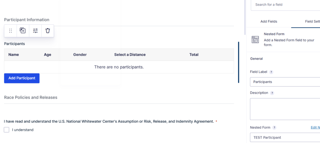 - Create a “Nested” form for the fields that are repeated for registrants. Set up all of the fields that are repeated (name/age/etc).
